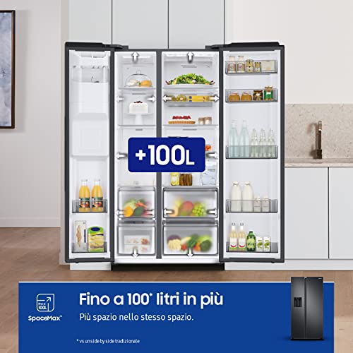 Caratteristiche: Frigorifero Side by Side a libera installazione. Dispenser dell’acqua senza allaccio idrico. Tecnologia SpaceMax. Capienza: 634L. Dimensioni: 91l x 178h x 72p cm. Colore: Black Matte.